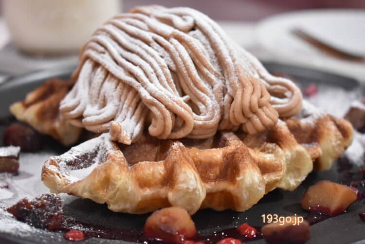 見た目はワッフル、生地はクロワッサン「クロッフル」に栗ペーストがたっぷり乗っている~。