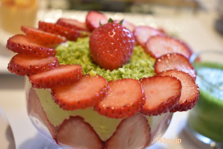 パフェグラスの淵にいちごが並べられ、まるでお花畑のようなピスタチオといちごの豪華パフェ!