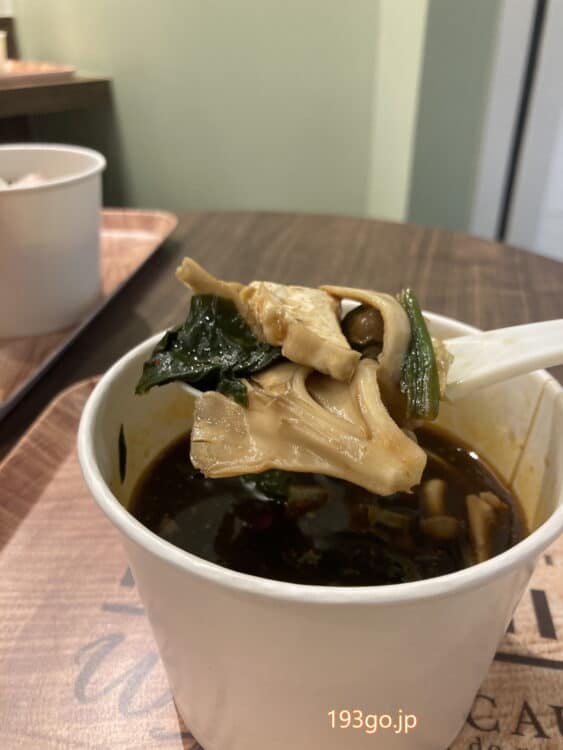 カップに熱々、キクラゲや舞茸、しめじなどの茸たっぷり。柔らかいほほ肉も。