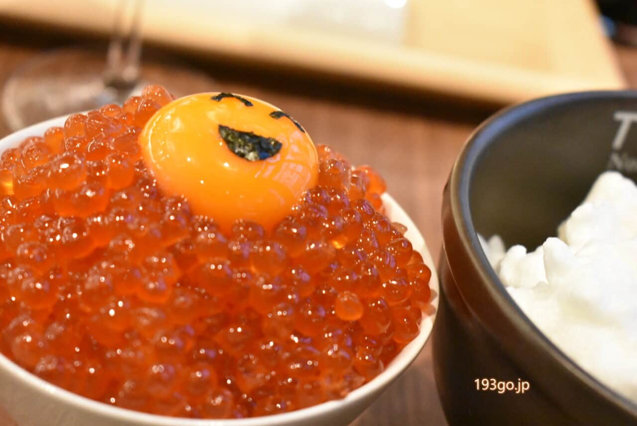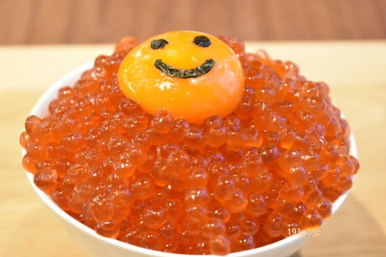 山盛りいくらの天辺で自信満々の笑顔の黄身。写真映えも抜群。