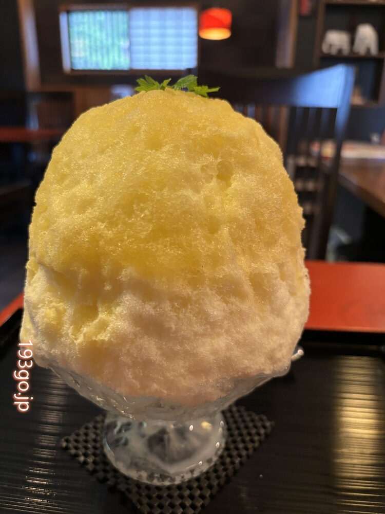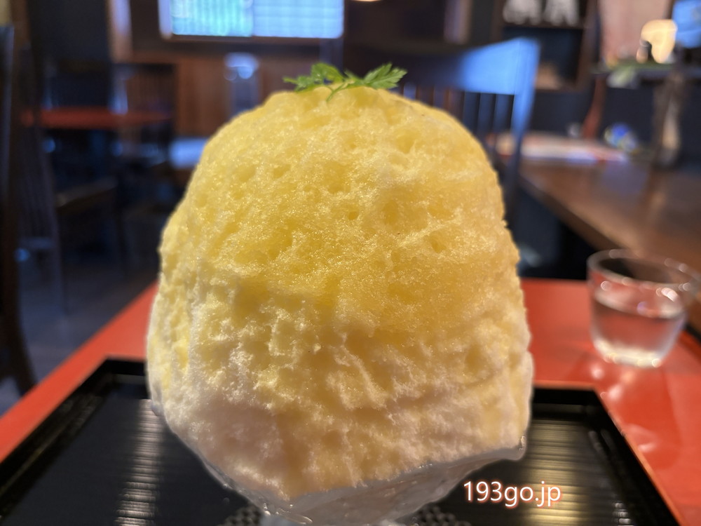 こんもり丸く盛られたかき氷に柑橘シロップが浸みてる。