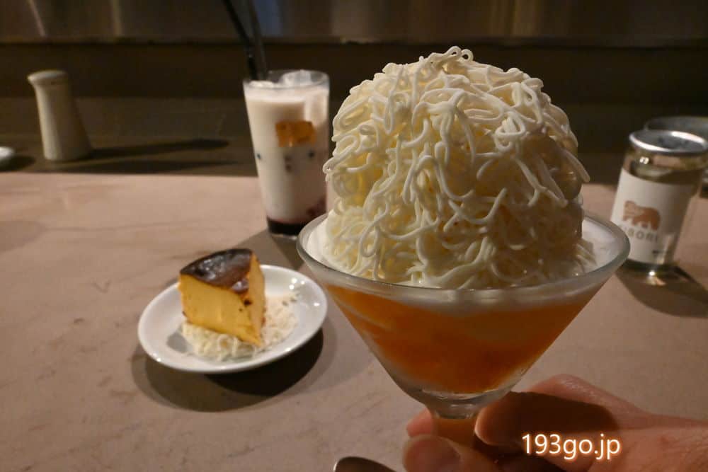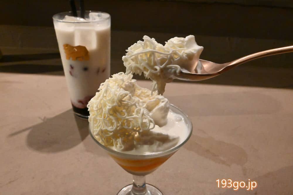 クリームチーズモンブランの下には、メロン果肉とジュレ、北海道ミルクソフトクリーム。ミニサイズでも味わい深く、食べ応えあり。