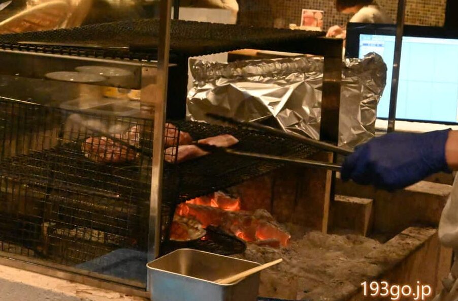 北海道から直送便で運ばれる魚介の刺身や炉端焼き、オープンキッチンで炭火で魚を焼き上げる職人技を見ながら。