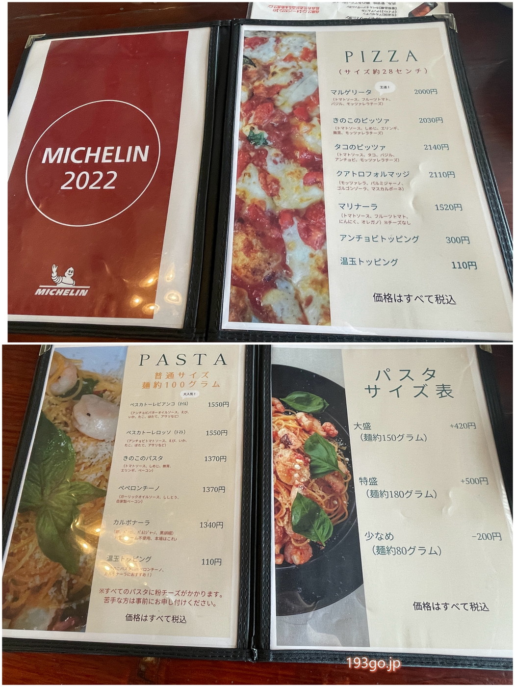 メニューはピザ、パスタ、サイドメニュー、ドルチェ、イタリアワインなど。