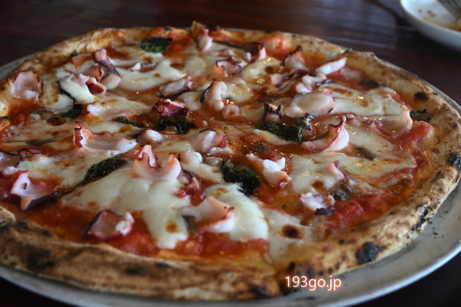 プリプリのタコとモッツァレラチーズにアンチョビの塩気がアクセントのピザ。タコ好き、チーズ好きにはたまらない味わい。
