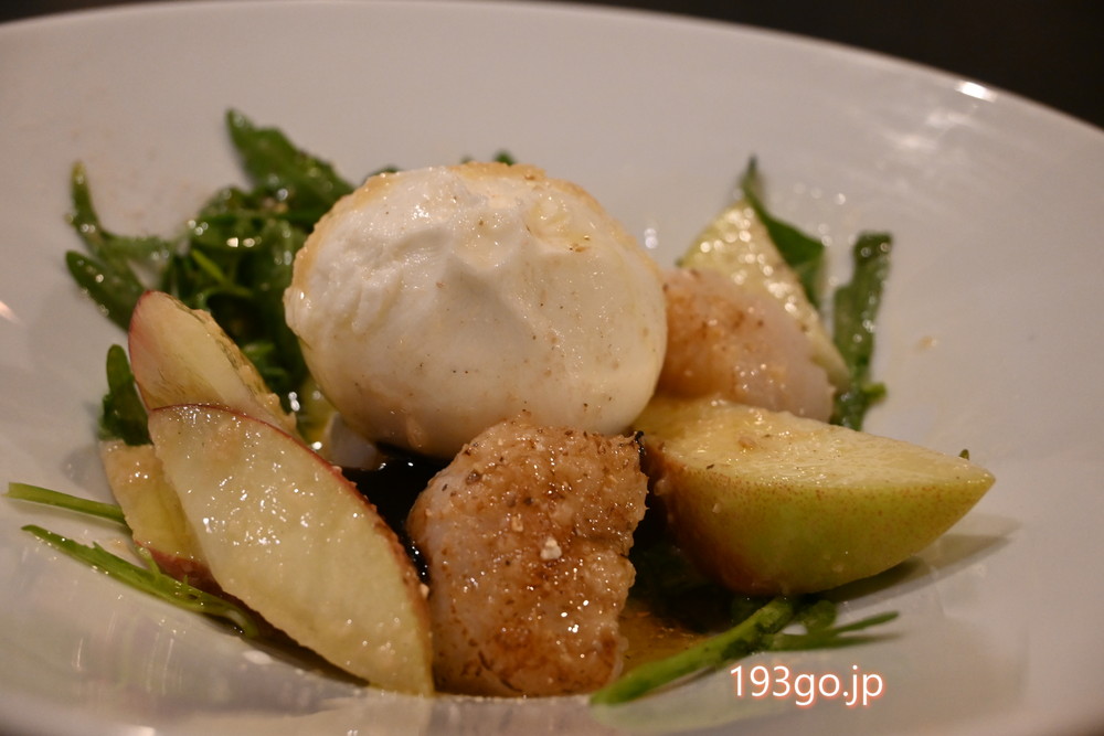 前菜「ホタテと桃とブッラティーナ」