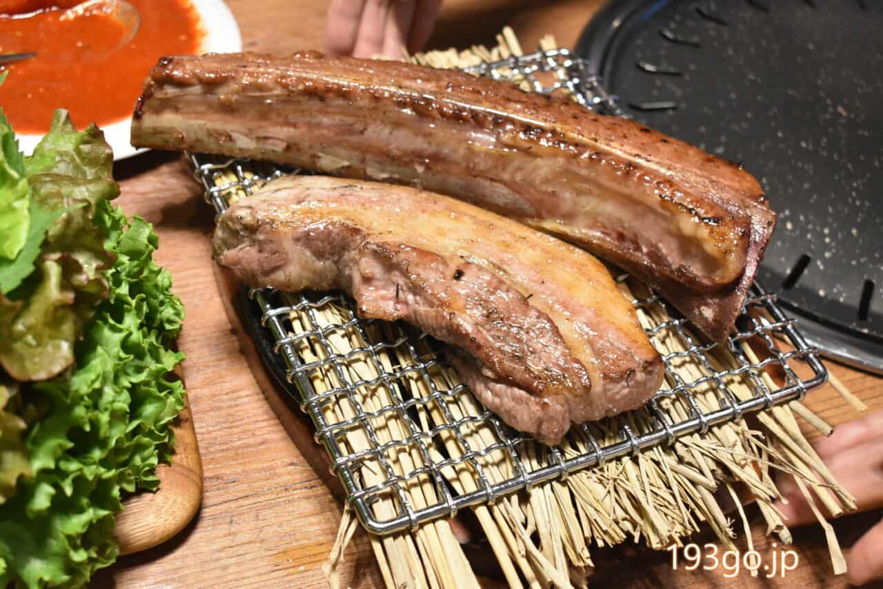 分厚くボリューミーなバラ肉、サムギョプサルは脂も甘みがあり、ジューシーで、炭火とワラの香ばしい風味がして、とっても美味しい。