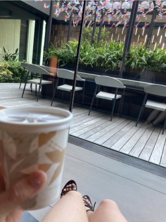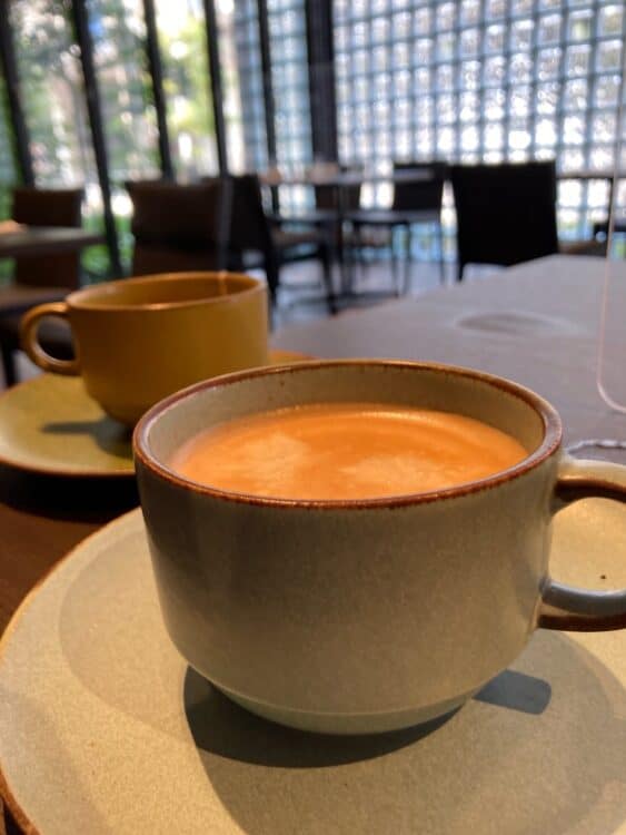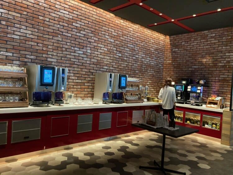 ジュース類と、コーヒーマシーンも設置されカフェラテ、カプチーノなどのカフェドリンク&ティーが楽しめる。テイクアウト用のカップもあり、温かい飲みものを持ち出せたのも良かった!