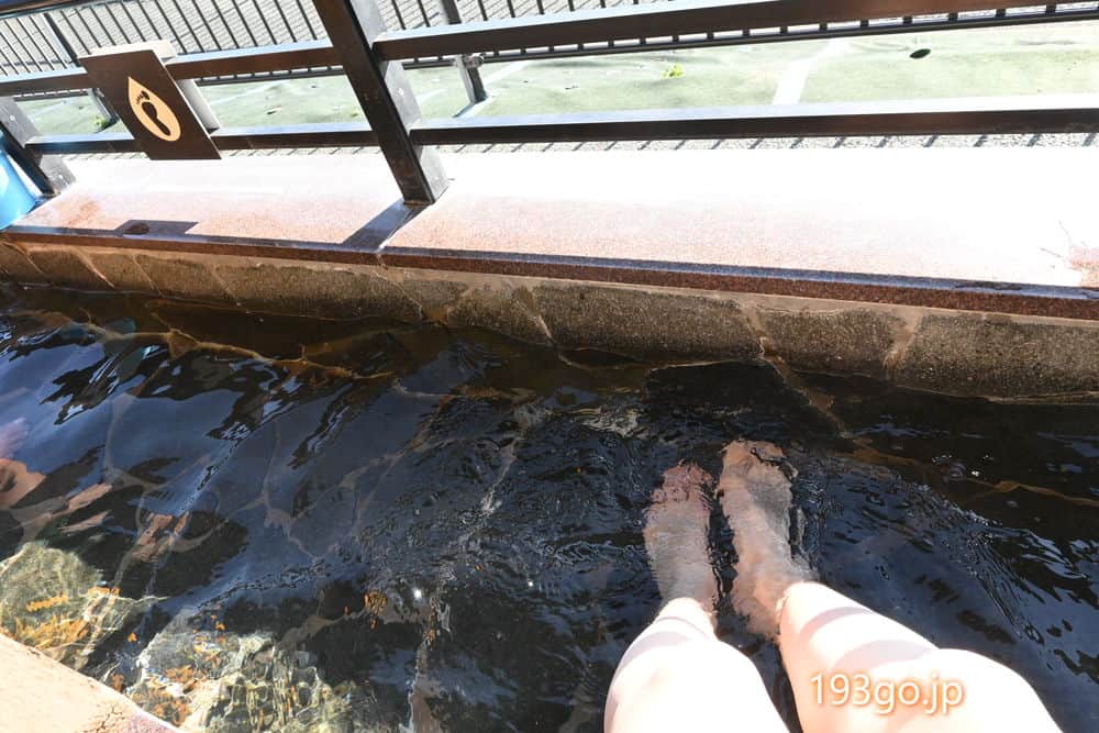 なかなか熱めの湯。運転で座りっぱなしだと足腰がだるくなってくるけど、足湯に入ってサッパリ、リセット!