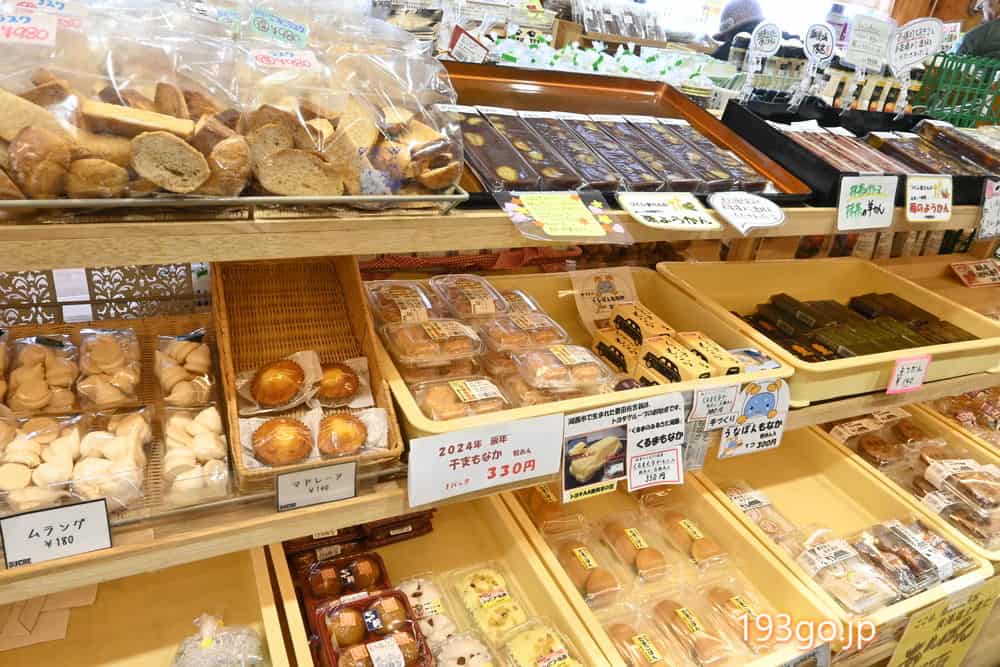 売店では、地場産のとれたて野菜や果物、近隣のお土産、海産物などが販売。