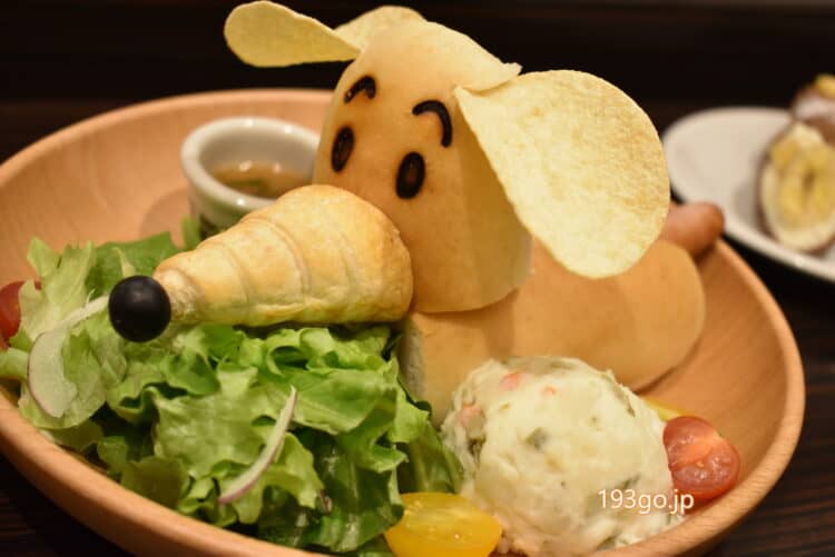 パンの鼻、チップスターの耳、ソーセージのしっぽの丸ごと「ハンドリー」のホットドッグ、青いリボンがトレードマークの「ニョッキ」のキャラメルプリンなどキャラクターがモチーフになったユニークなメニューが勢ぞろい。