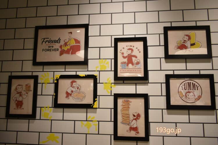 イエローがモチーフの店内はバナナが積まれていたりグッズや絵本が所狭しと飾られ、壁にはコックコートを着用したおさるのジョージカフェ限定デザインのイラストも。