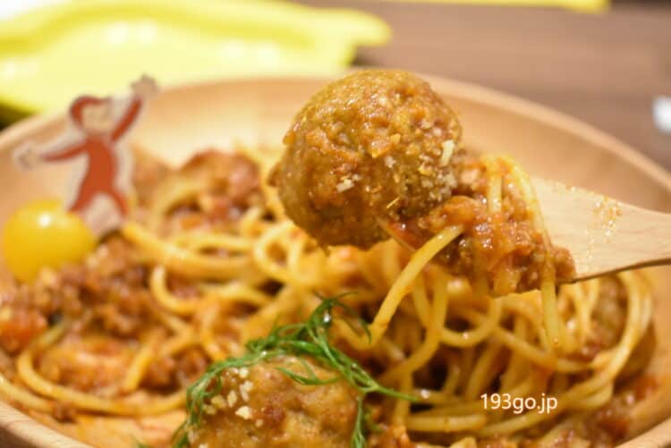 ミートボールがゴロゴロ乗ったソースもたっぷりのパスタは食べ応えあり