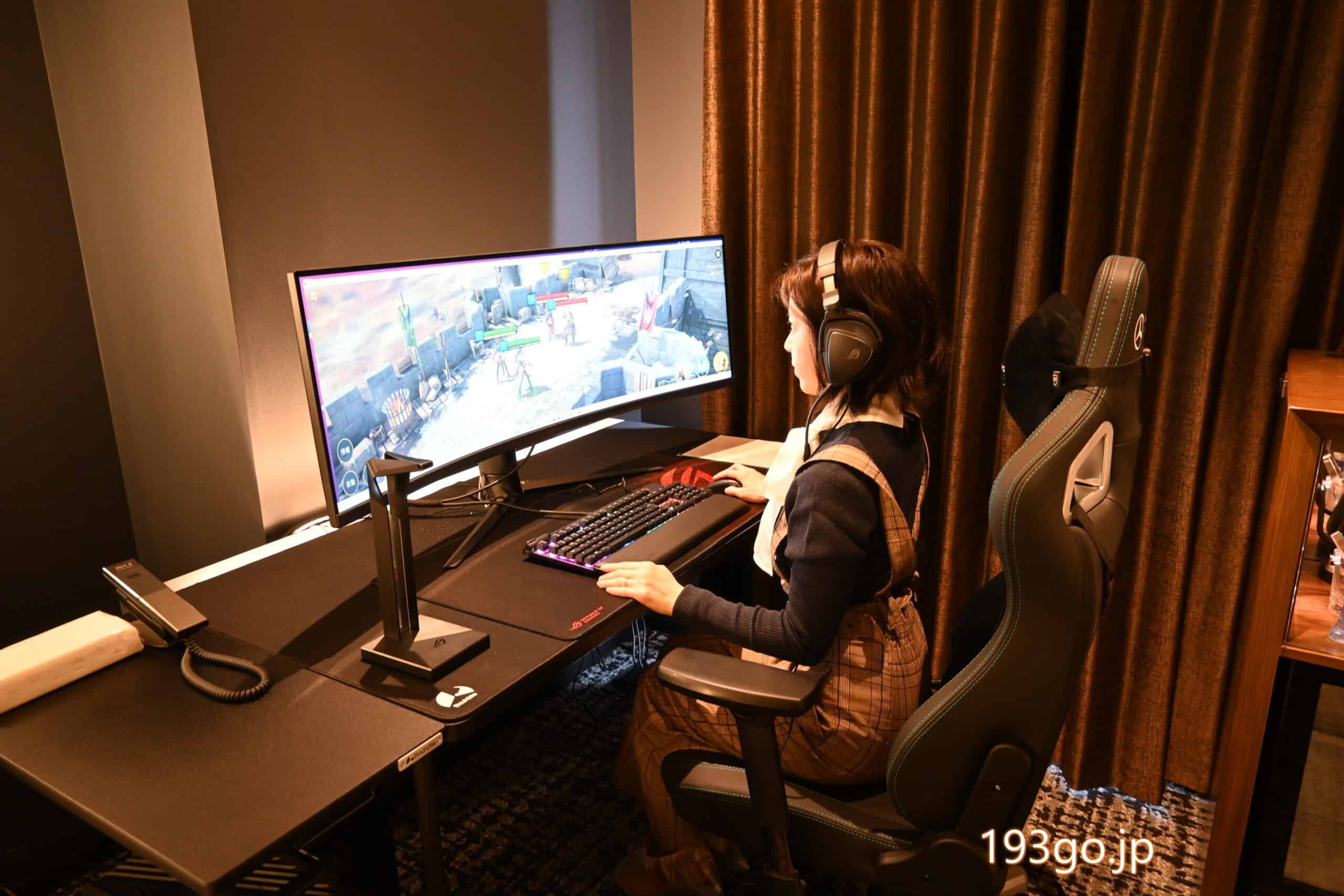 49インチのワイドスクリーンのゲーミングモニター、チェア、ヘッドフォン、さらにライティングにもこだわり、臨場感のある演出の中、人目を気にせずゲーム体験に集中できてテンションが上がる、大人のためのゲーミングルーム。