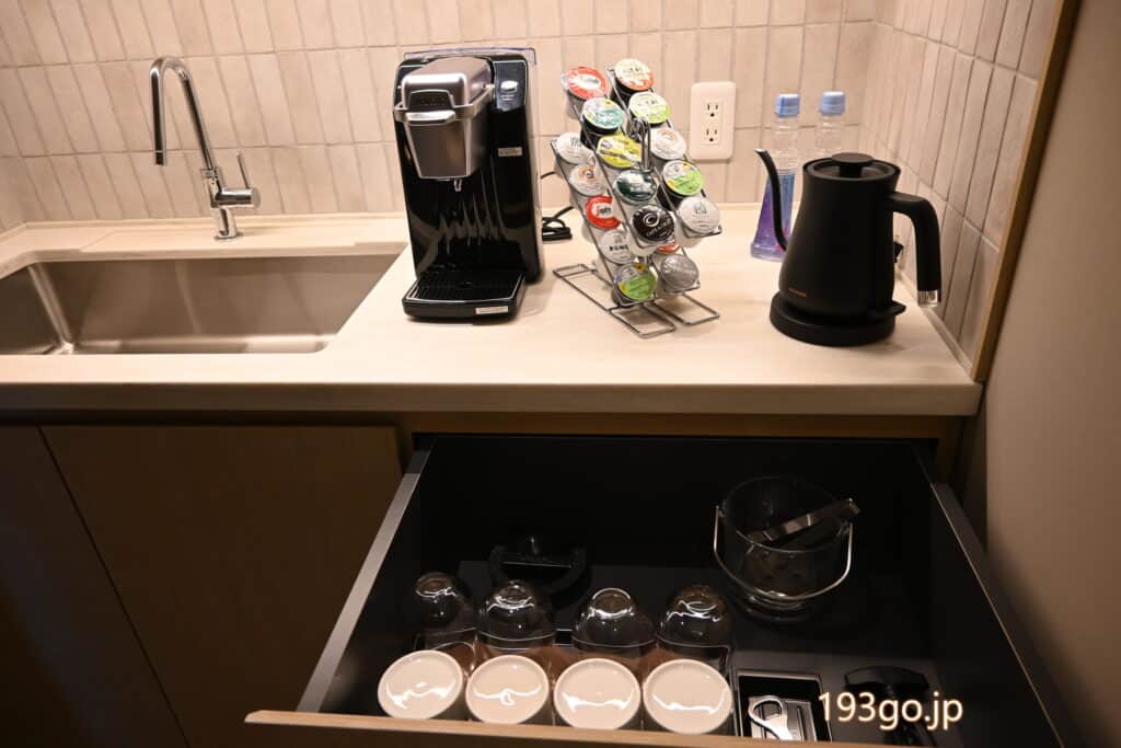 電子レンジ、冷蔵庫、20種類のカプセルが楽しめるコーヒーメーカーが設置。