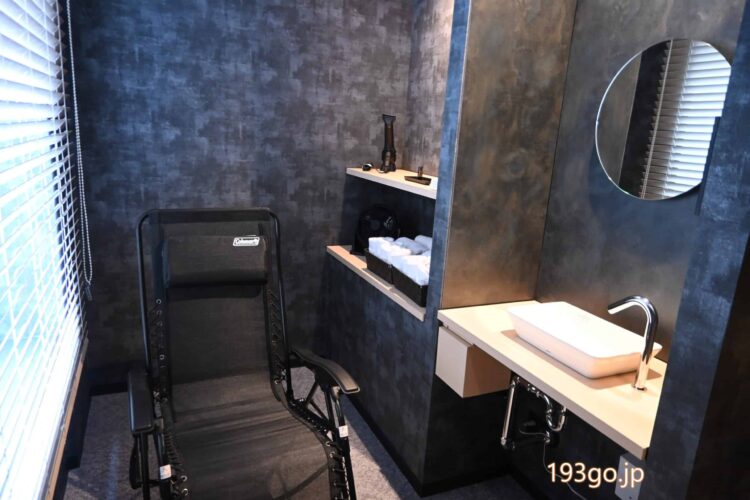 「Saunaルーム」コンパクトなスペースの中に“サウナの本場、フィンランドのmisa社のサウナストーブ、お好みでアロマ水も楽しめるセルフロウリュ、全身を優しく包み込んでくれるボディハグシャワーの冷水、宙に浮いているような座り心地のインフィニティチェアなどこだわりのアイテムが揃う。