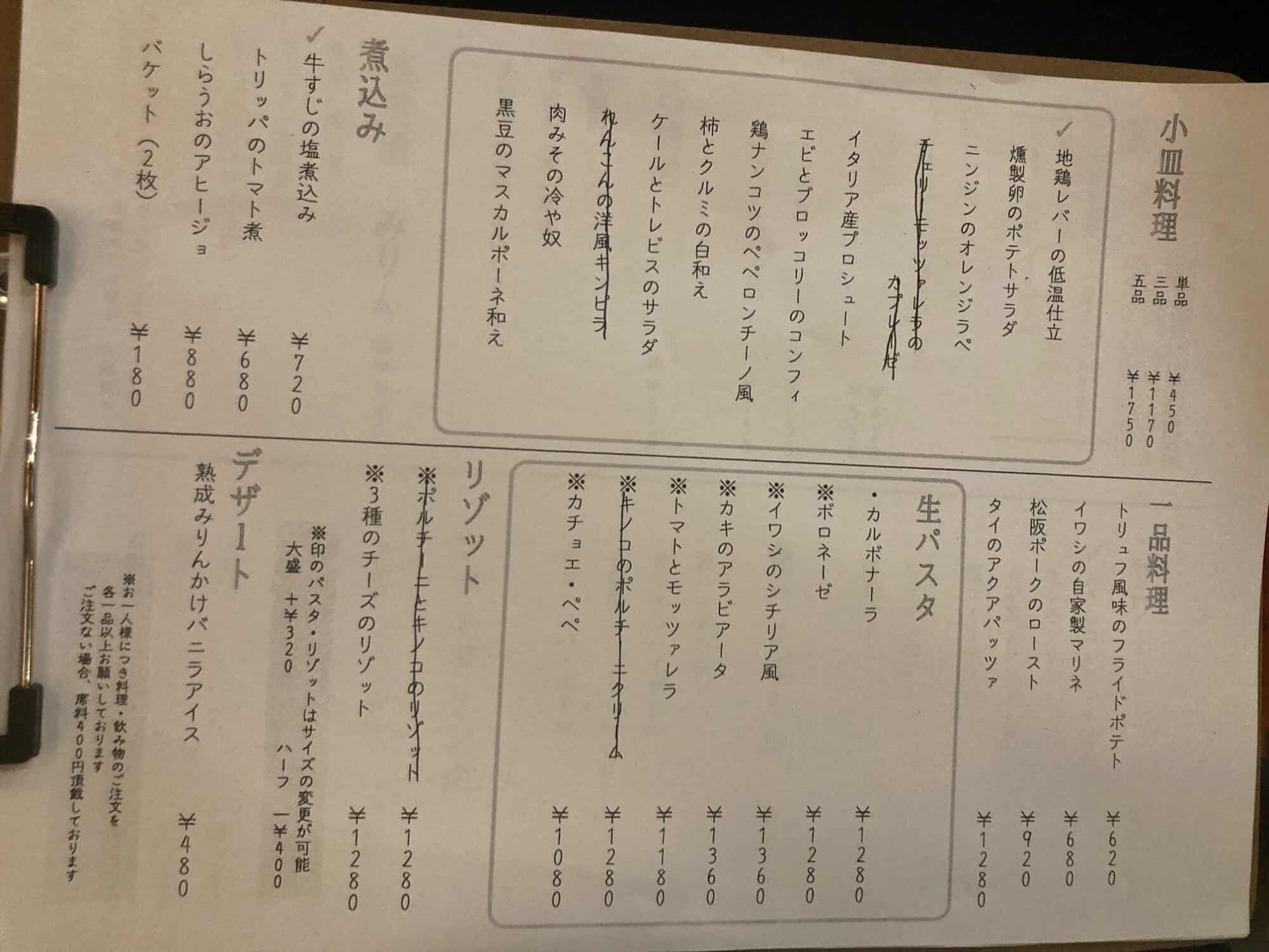 メニューは小皿料理、煮込み、一品料理、生パスタ、リゾット、デザートとあり