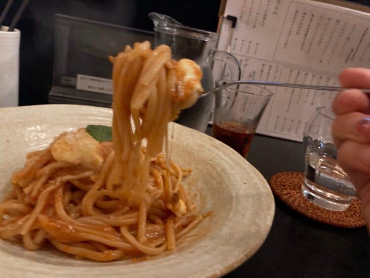 中太のもちもち生パスタに、酸味と甘みを感じるジューシーなトマトソース&モッツァレラの贅沢な食感!