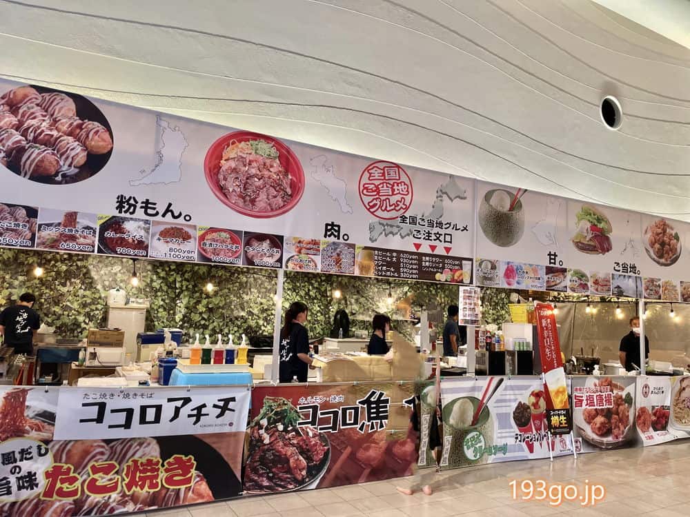 奥の屋台には、たこ焼き、焼きそば、カレー、ラーメン、冷やしぶっかけうどんなど。