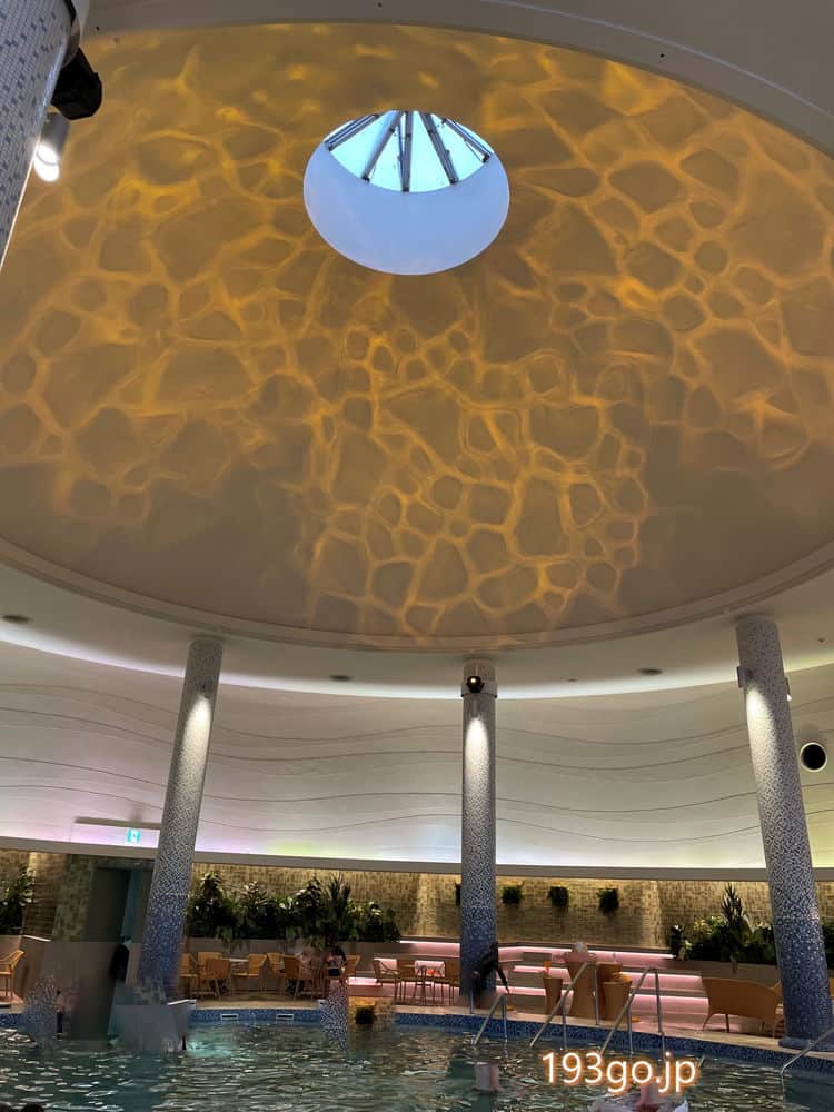 円形型の屋内温泉プール。温水のため、大きなジャグジーに入ってる感覚。