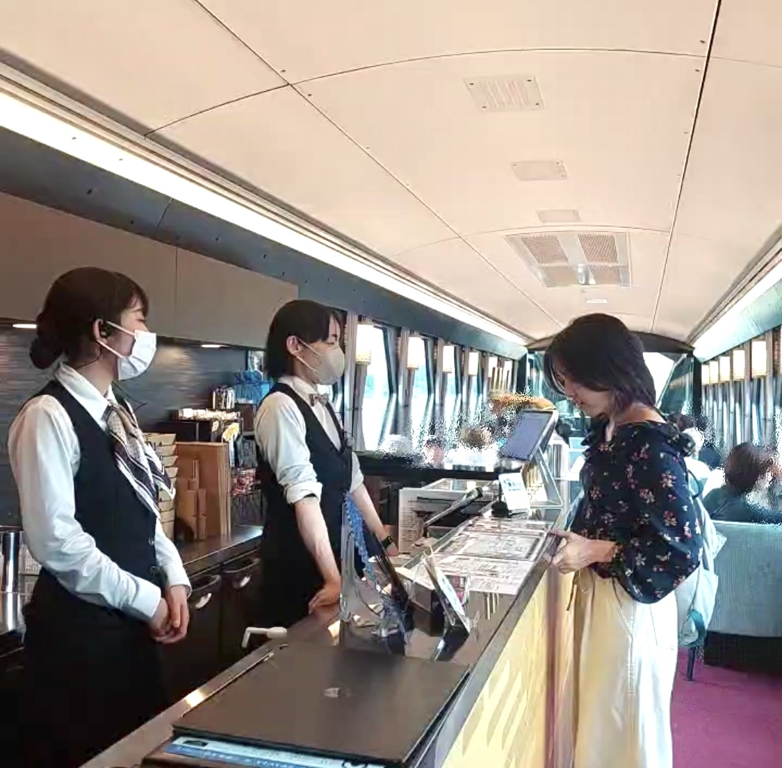 2~5号車の乗客は、1号車コックピットラウンジ内のカフェカウンターを利用するのに整理券が必要となる。車内アナウンスに沿ってスマホでQRコードを読み込み整理券をゲットし、時間になったら1号車へ。
