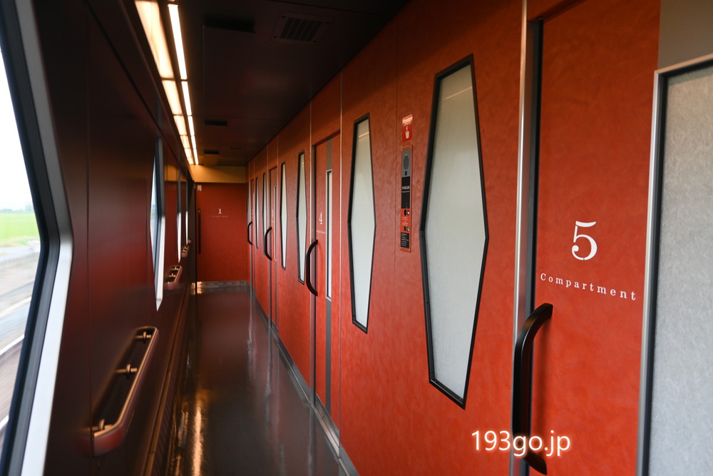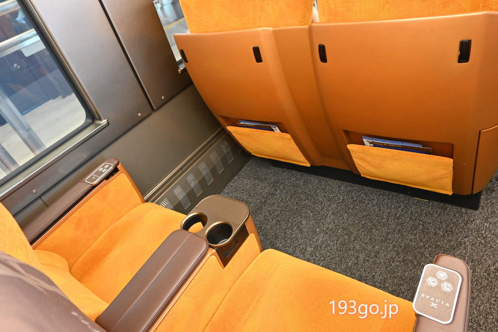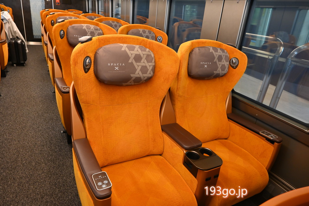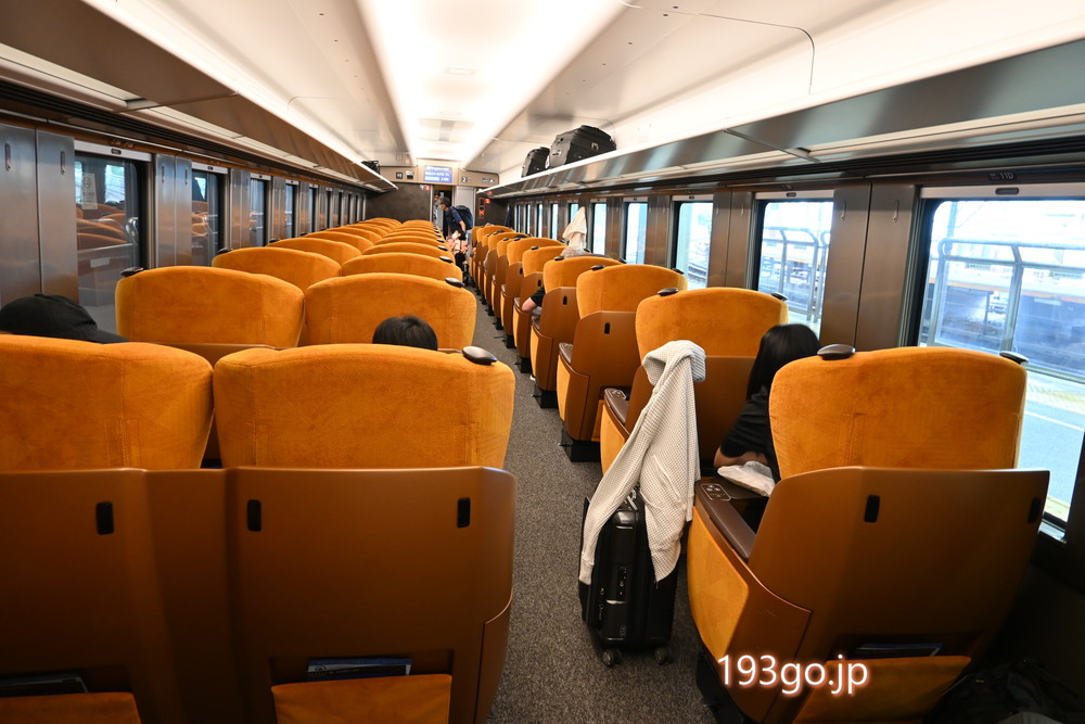 2号車のプレミアムシートは、グレーのじゅうたんに鮮やかな黄金色が映える高級感のあるデザイン。
