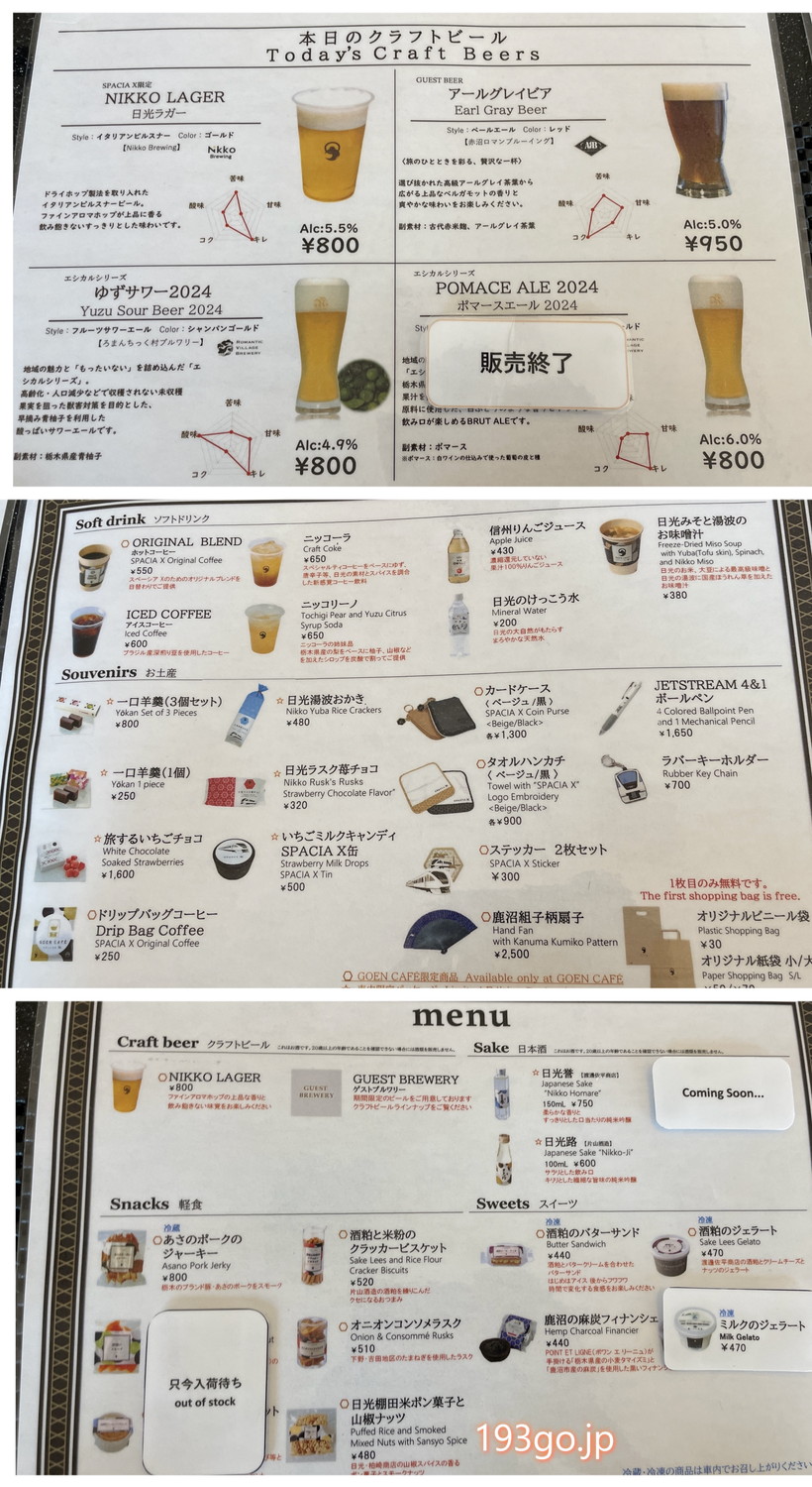 あさのポークのジャーキー、酒粕と米粉のクラッカービスケット、日光棚田米ポン菓子と山椒ナッツ、酒粕のバターサンド、酒粕のジェラート、一口羊羹、旅するいちごチョコ、日光湯波おかきなどのご当地スナックの他、カードケースやタオルハンカチ、ラバーキーホルダー、ボールペンなどのグッズ販売。かなり種類豊富。