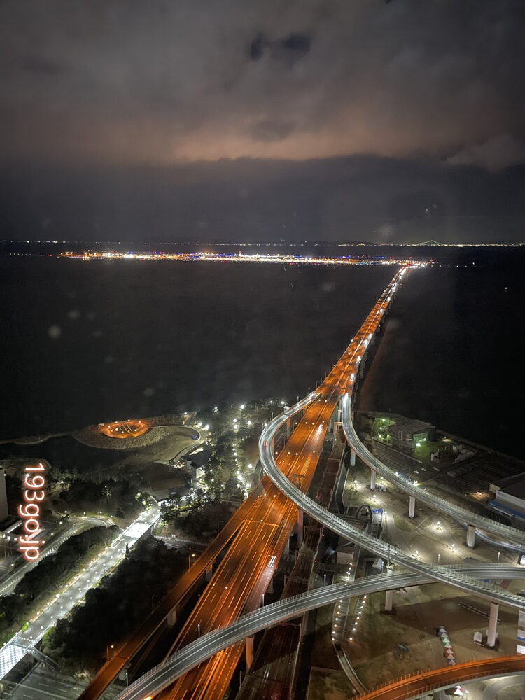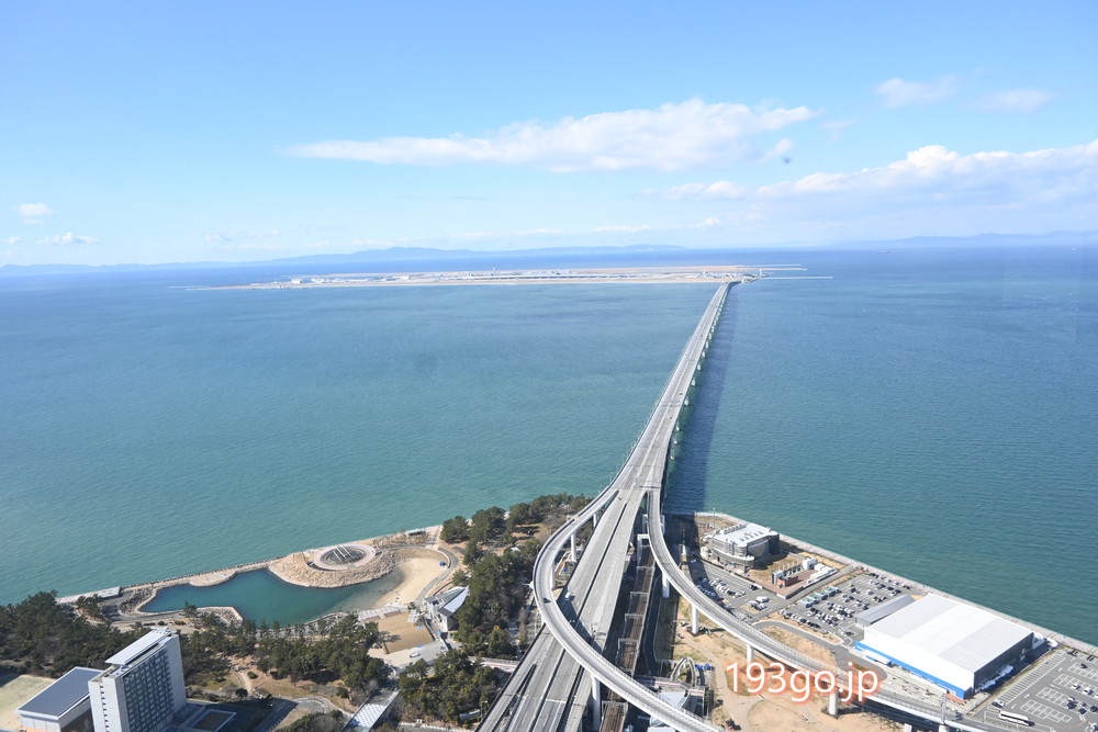 大阪湾に囲まれたロケーションで、大阪市方面のビル群、もう一方では関西国際空港の滑走路から離発着する飛行機を。