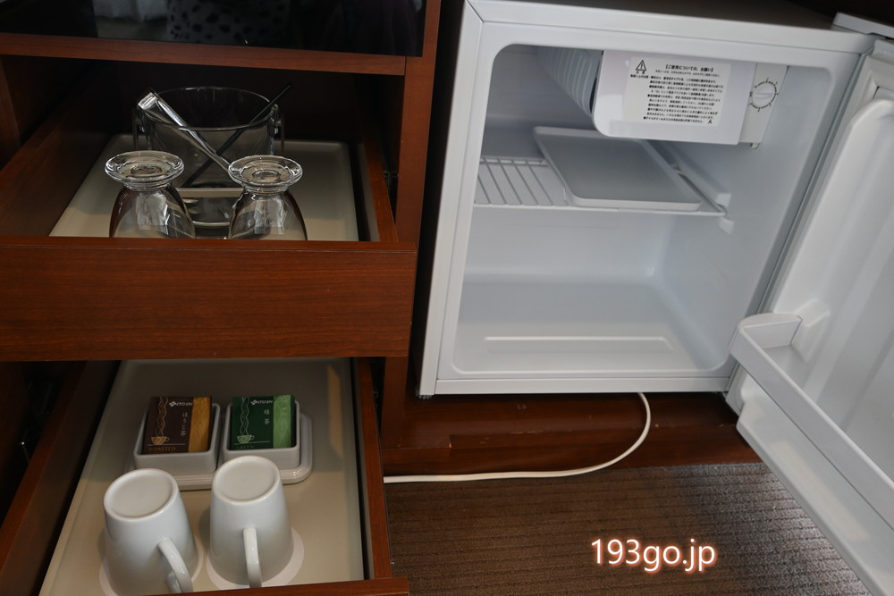 テレビ台の下には、冷蔵庫やティーセット、電子ケトルなどが収納。