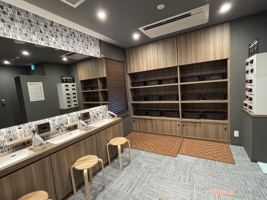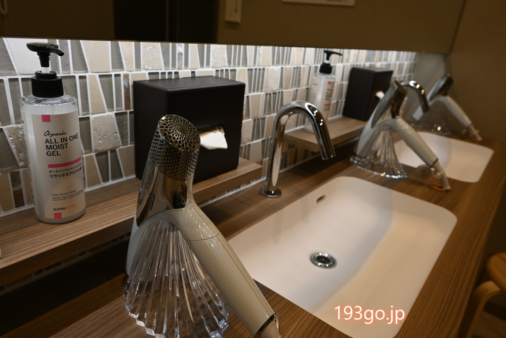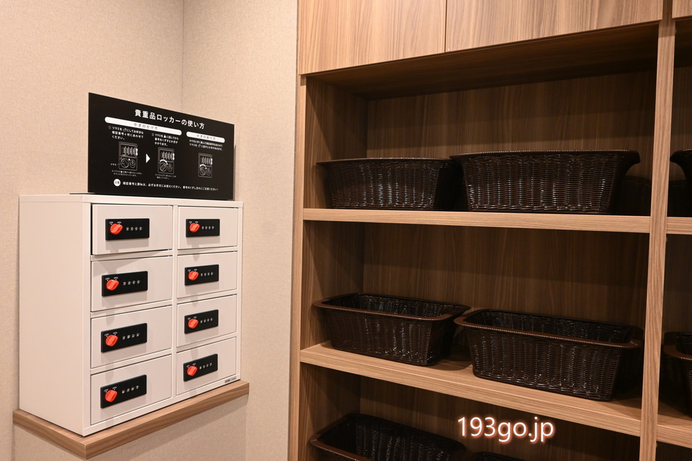 脱衣場には貴重品ロッカー、脱衣かご、洗面台、ReFa(リファ)のドライヤー、オールインワンジェル、ヘアクリームが用意されている。