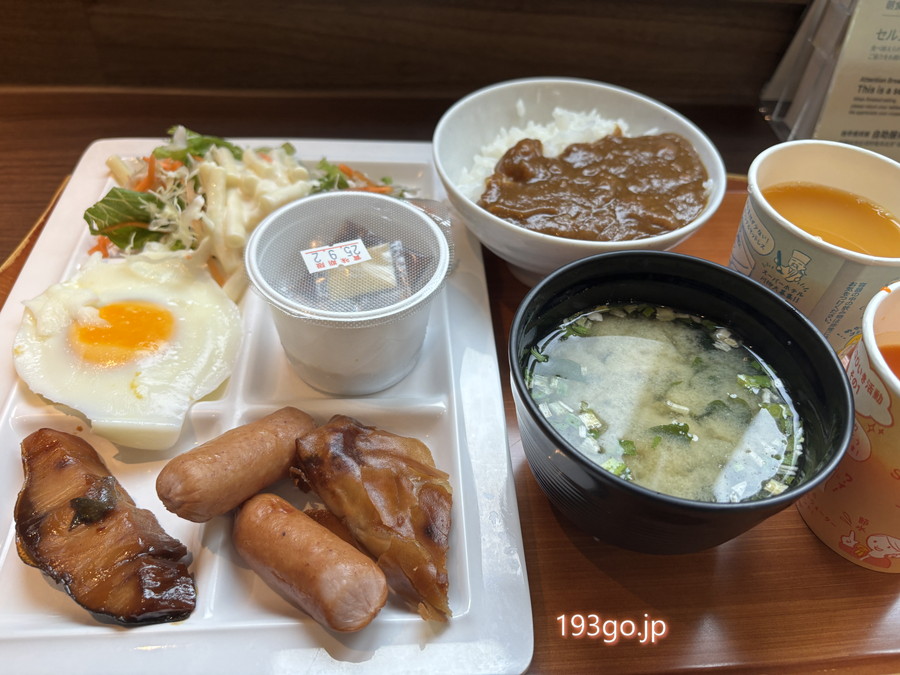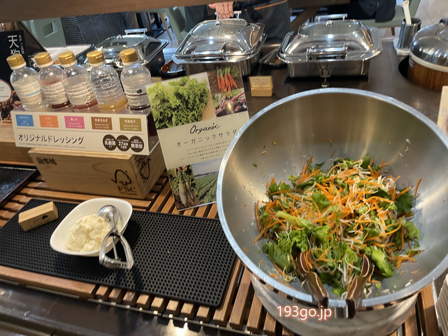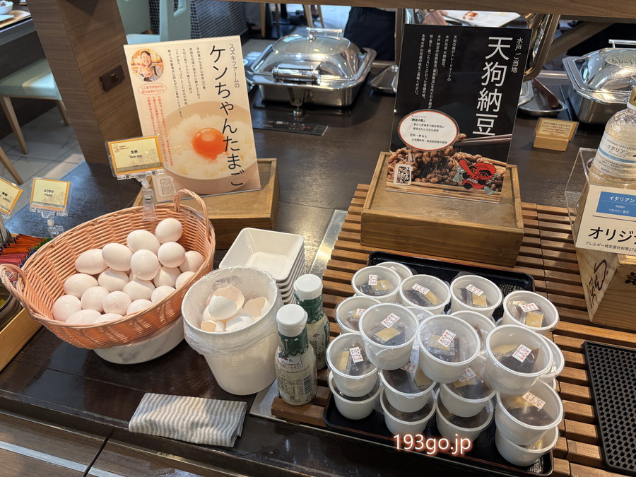 ビュッフェ台からサラダや焼きたてパン、焼き魚、カレー、ケンちゃんたまご、天狗納豆、夏限定のパンケーキなど気になるメニューをピックアップ。