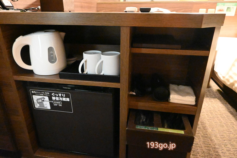 デスク下部にポット、カップ、ミニ冷蔵庫、ごみ箱などが収納。