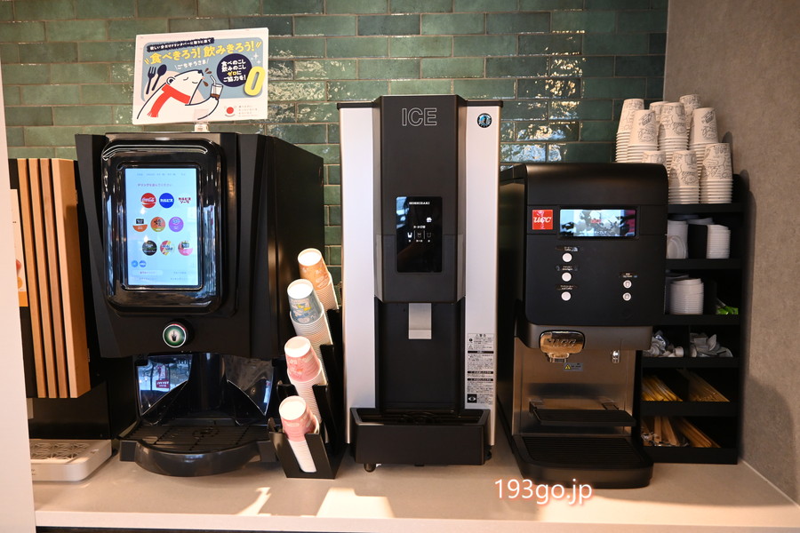 冷蔵庫やカップ、ポット、ドライヤーなどが収納されたカウンターは