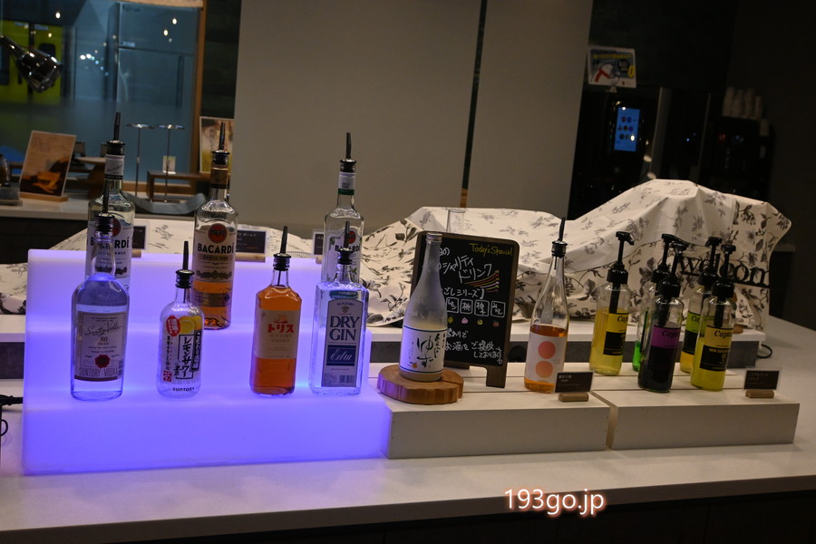 夜は、日本酒、焼酎、リキュール類など各種ボトルが並び、