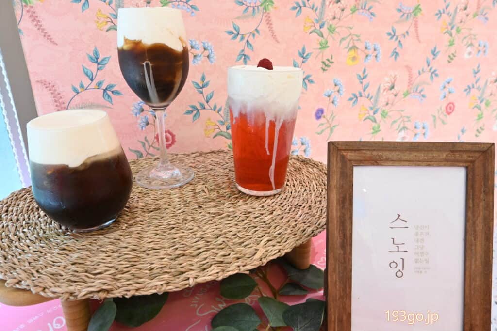 コールドブリューのコーヒーに手作りクリームをたっぷり乗せ可愛いワイングラスで提供する「SUNOWING(スノイン)」