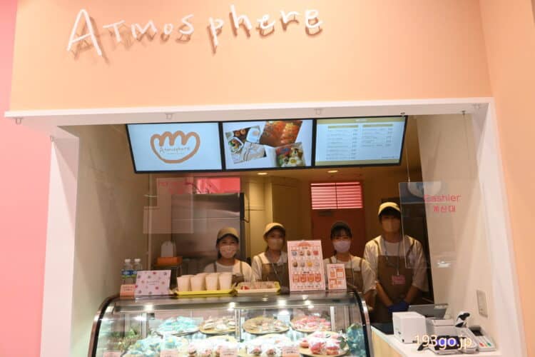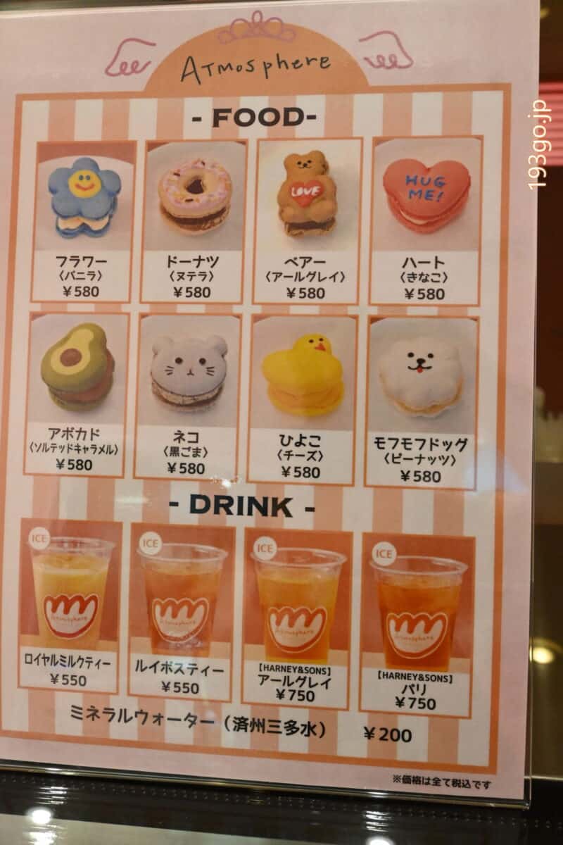 ブルーのお花やクマちゃん、ピンクのハート型などカラフルなマカロンが売られている「Atmosphere(アトモスフィア)」