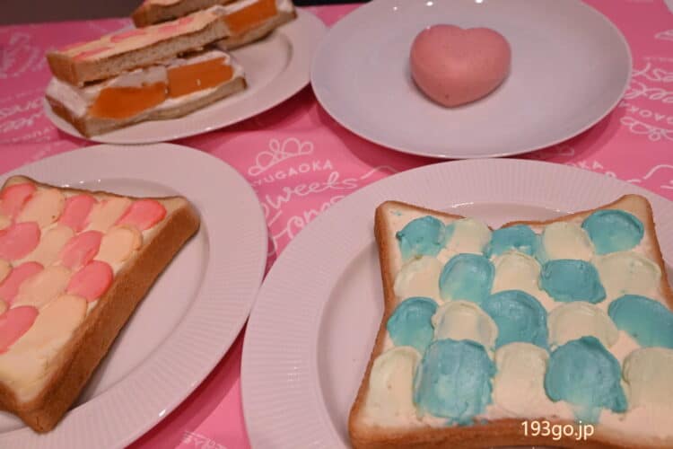 絵具で色を塗った様な水色やピンクが可愛いウェーブトーストの他、季節の果物を挟んだボリューム感満載のトーストサンドや、まるでレモンの様なレアチーズケーキ、甘酸っぱいベリーのハートムースケーキも。