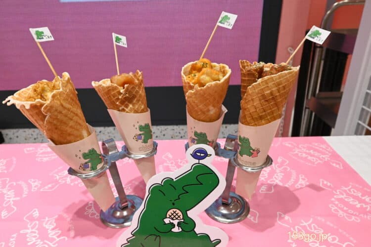 緑色のワニがモチーフ!ワッフルコーンにチキンや海老を巻いてアイスクリームのように食べる「CHICONE(チコネ)」