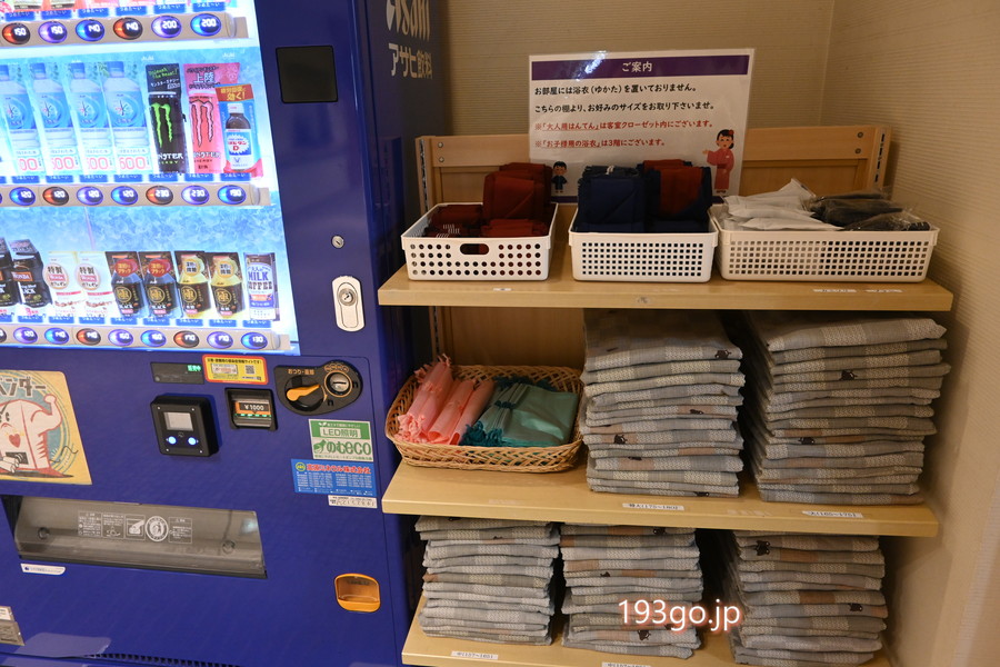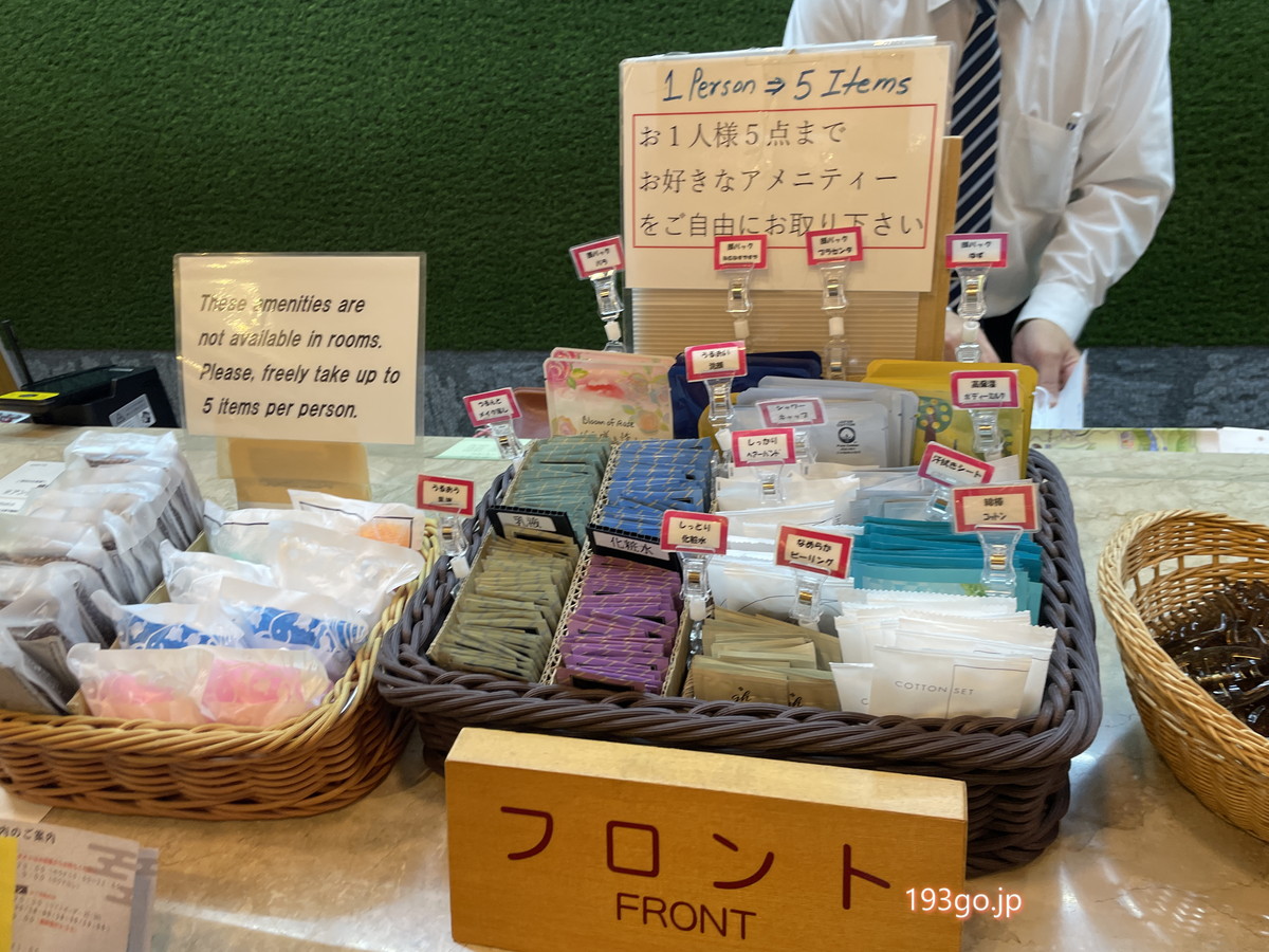 チェックイン時にロビーでアメニティと浴衣をピックアップ。