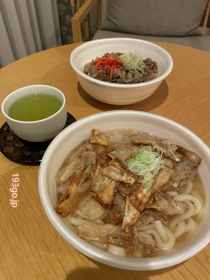 この日の夕食は、牛丼とごぼ天うどんを注文。(室内にメニュー表が置かれていた)