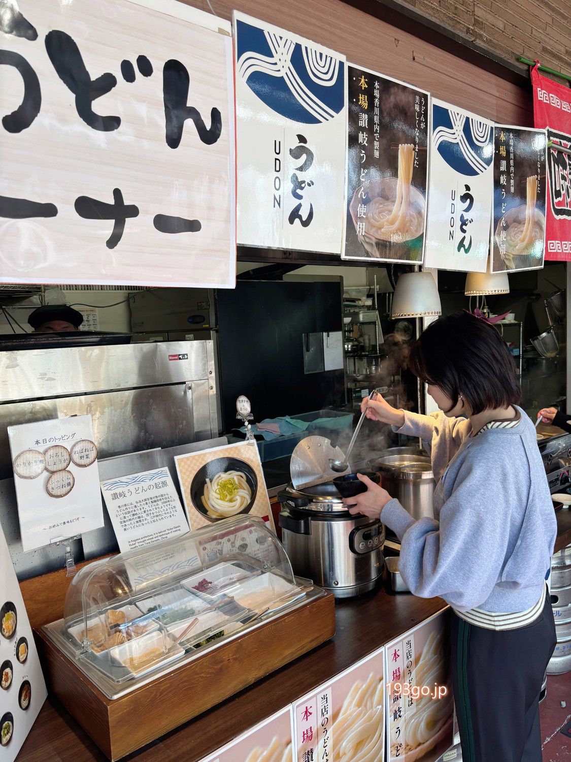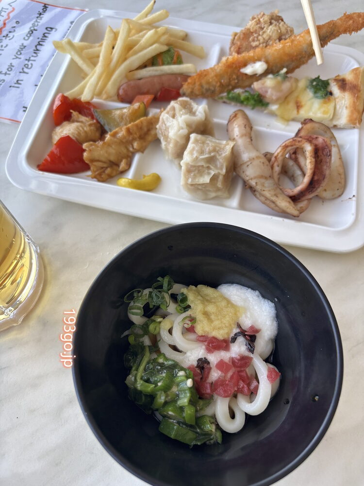 更に、自分でトッピングして盛り付けるうどんは、かけうどん・ぶっかけと楽しめ、バーベキューコーナーでは焼きたてのウインナーや浜焼きをゲット。