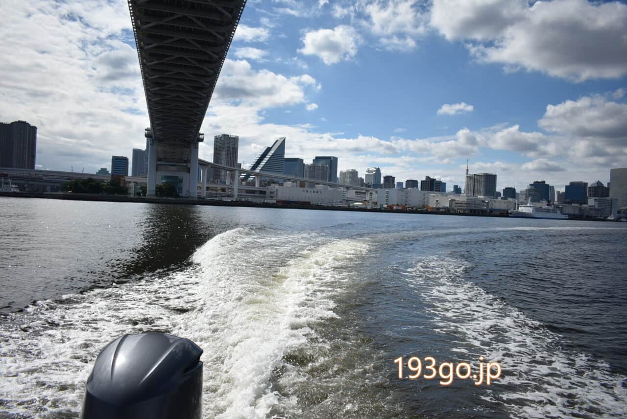 レインボーブリッジが近づいてくるダイナミックな景色と、橋の下をくぐりぬけ、東京タワーが現れ、今度は遠めにレインボーブリッジが見れたりと、東京のビル群も広い海から望むといつもとまるで違った風景に。