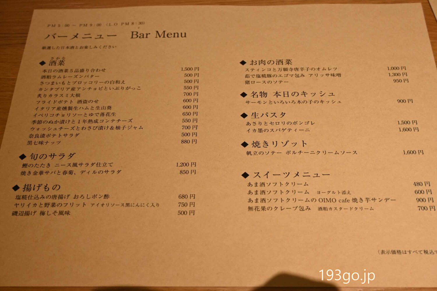 メニューは、時間に応じてバーメニュー(17:00-21:00)、スイーツ(11:00-21:00)に、ランチメニュー(11:00-14:00)も。