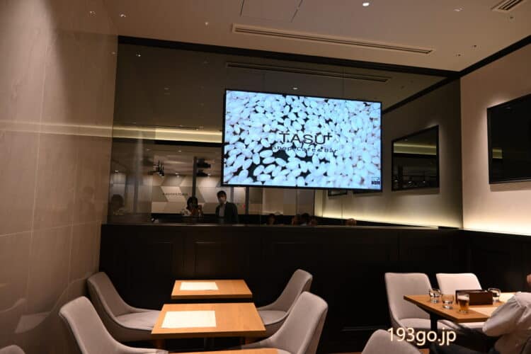 料理と日本酒とのペアリングが楽しめるカフェ&バー「TASU+(タスプラス)」へ。ショップも併設。バーカウンターと、奥にはゆったりした席も。