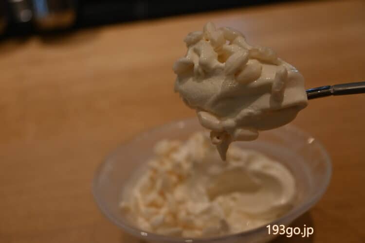 ソフトクリームはスプーンですくうと、ねっとりと濃厚でなめらか、甘酒の優しい甘みで後味スッキリ。
