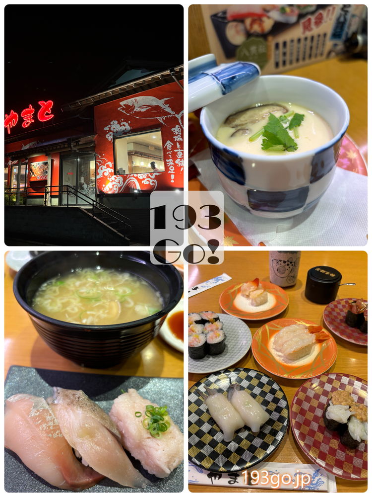 千里の風で海が見える温泉に入って、夜は回転寿司「やまと」(21時半まで営業)でお寿司を食べて帰宅。