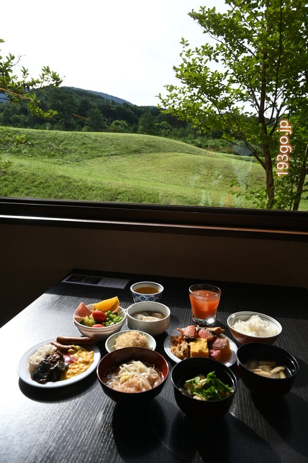 広い会場に、料理がズラリ。窓の外には緑が広がっている。