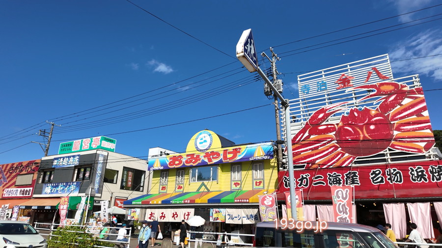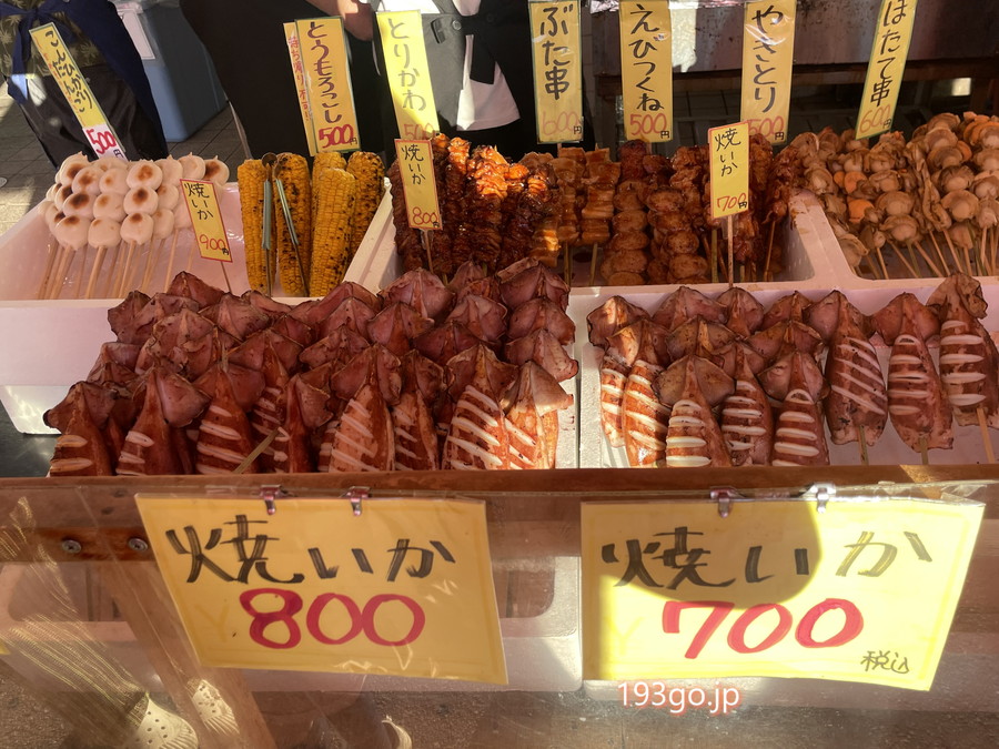 新潟名物の紅ズワイ蟹やイカ焼きの他、鮮魚がズラリ並んでる。