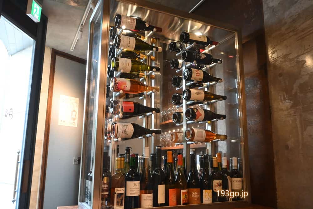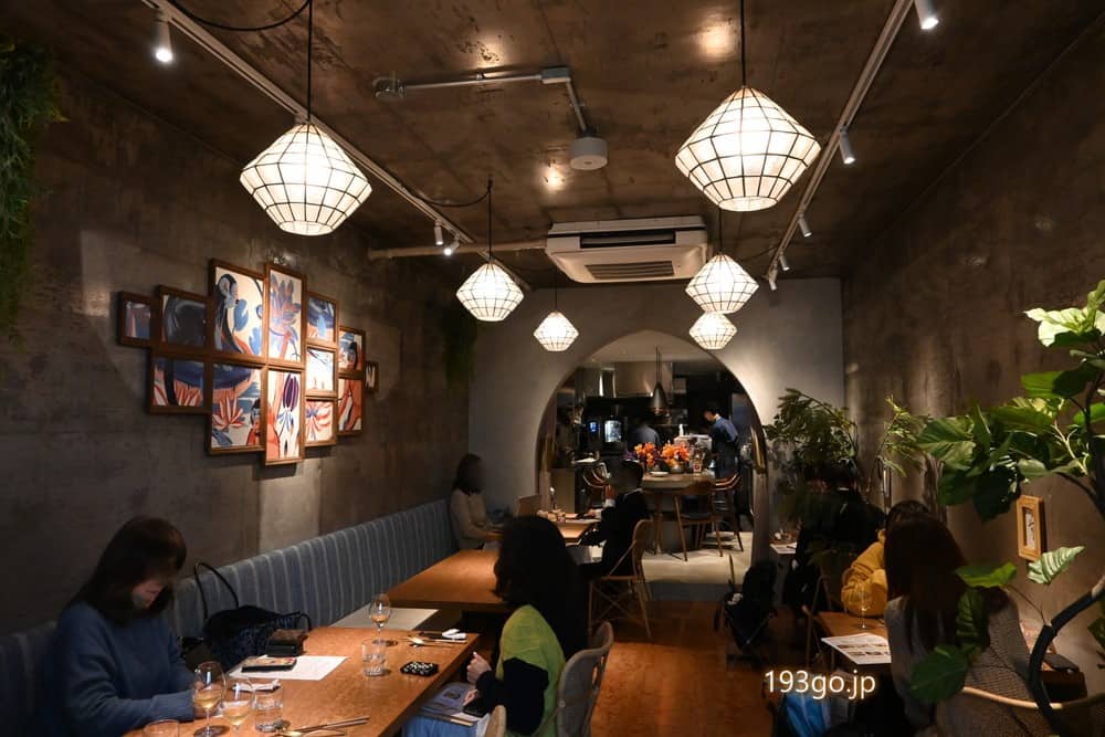 路地を入る隠れ家的な店舗は、扉を開けると美しいワインセラー、グリーンの観葉植物と赤味を帯びたフロアがアジア気分を連想させる。