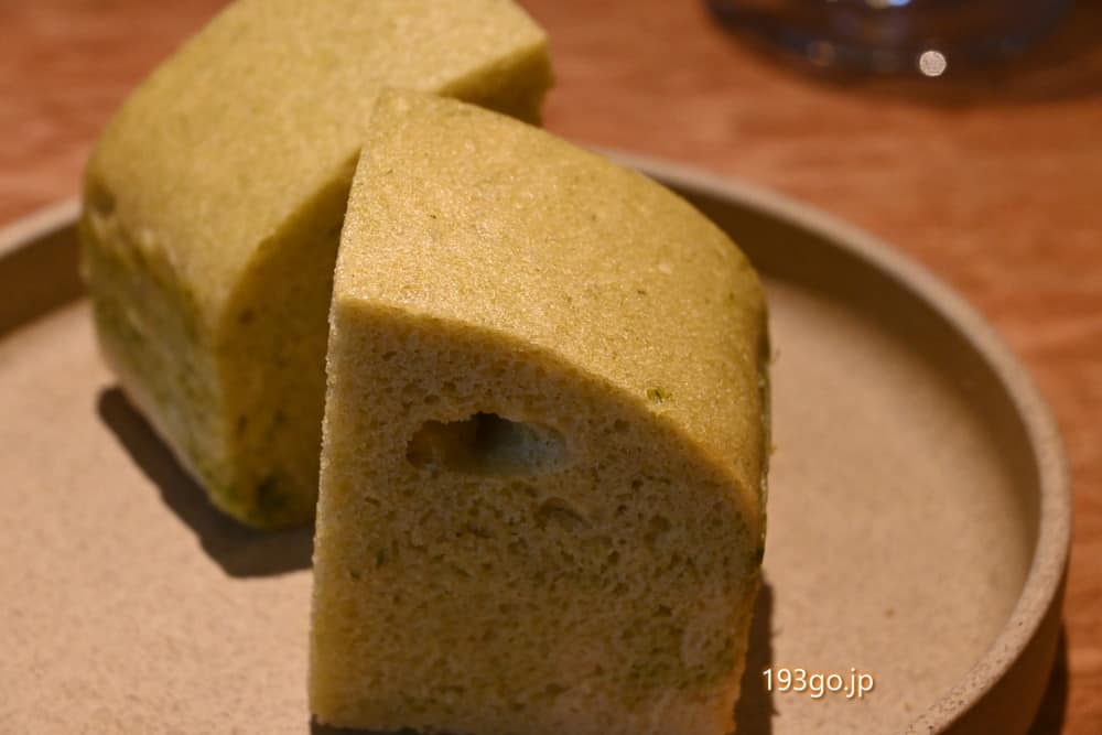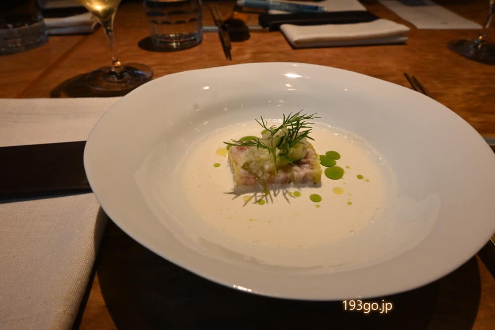 水揚げ当日に北海道から空輸したカスベ(エイ)と胡瓜、ちりめんキャベツのテリーヌをスプーンで崩していただきます。酸味やスパイスのピリッとした味わいに、スープに浮かんだグリーン色のバイマックルオイルがアクセント。“タイ”の風味が口いっぱいに~。